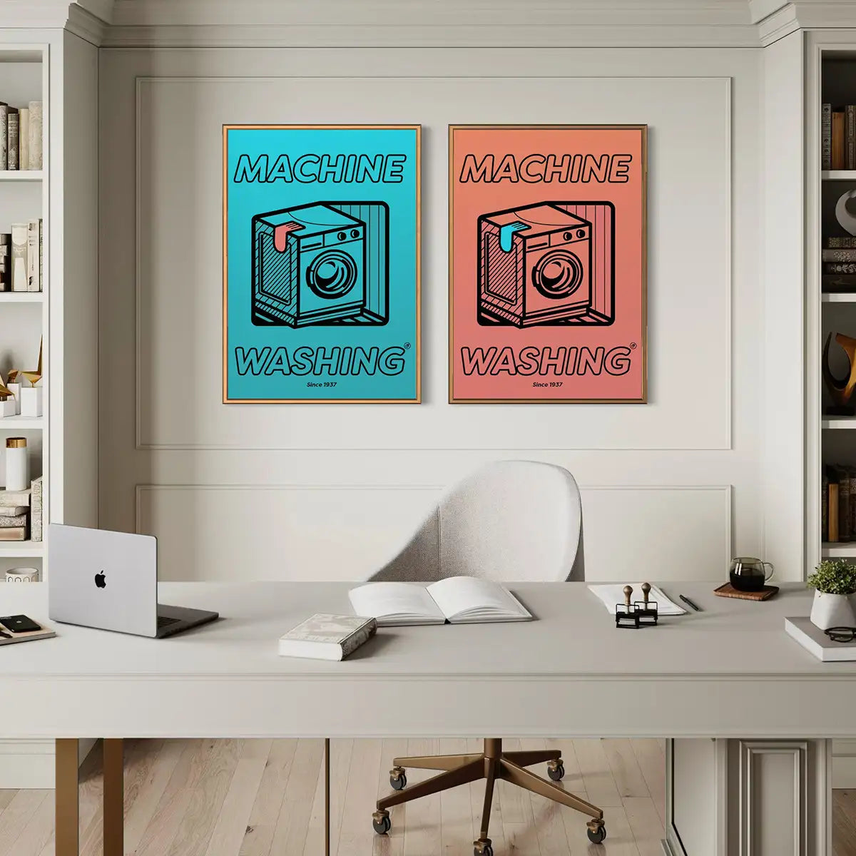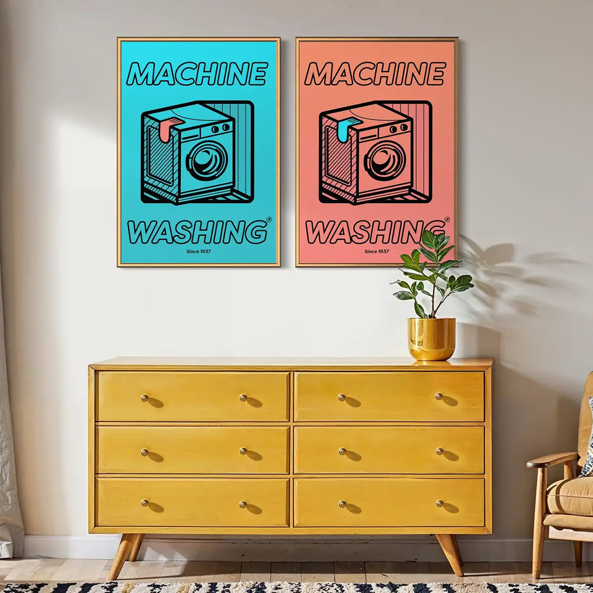 A bold, retro-inspired art print featuring a pop-art washing machine illustration with playful graphic lines and vibrant colour blocks. This piece blends vintage commercial aesthetics with modern design, making it a standout feature for laundry rooms, kitchens, utility spaces, and contemporary interiors that embrace whimsy and colour. The series "Machine Washing" is inspired by the first, automatic consumer washing machine from the company Bendix which was introduced back in 1937.